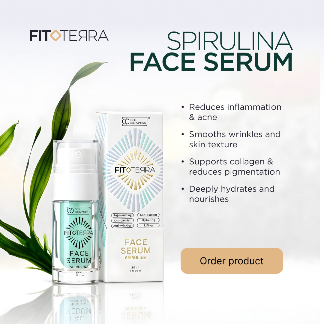 FITOTERRA high-quality concentrated Spirulina Serum products are made using the most modern technologies, without compromising the healing properties of spirulina. Thanks to “Cell Disruption” technology, we offer unique skin care products in which the active components in spirulina are activated. Disruption of spirulina cells allows the biological activity of each component of the spirulina composition to be effective and efficient, intensifying the respective effect and skin response.