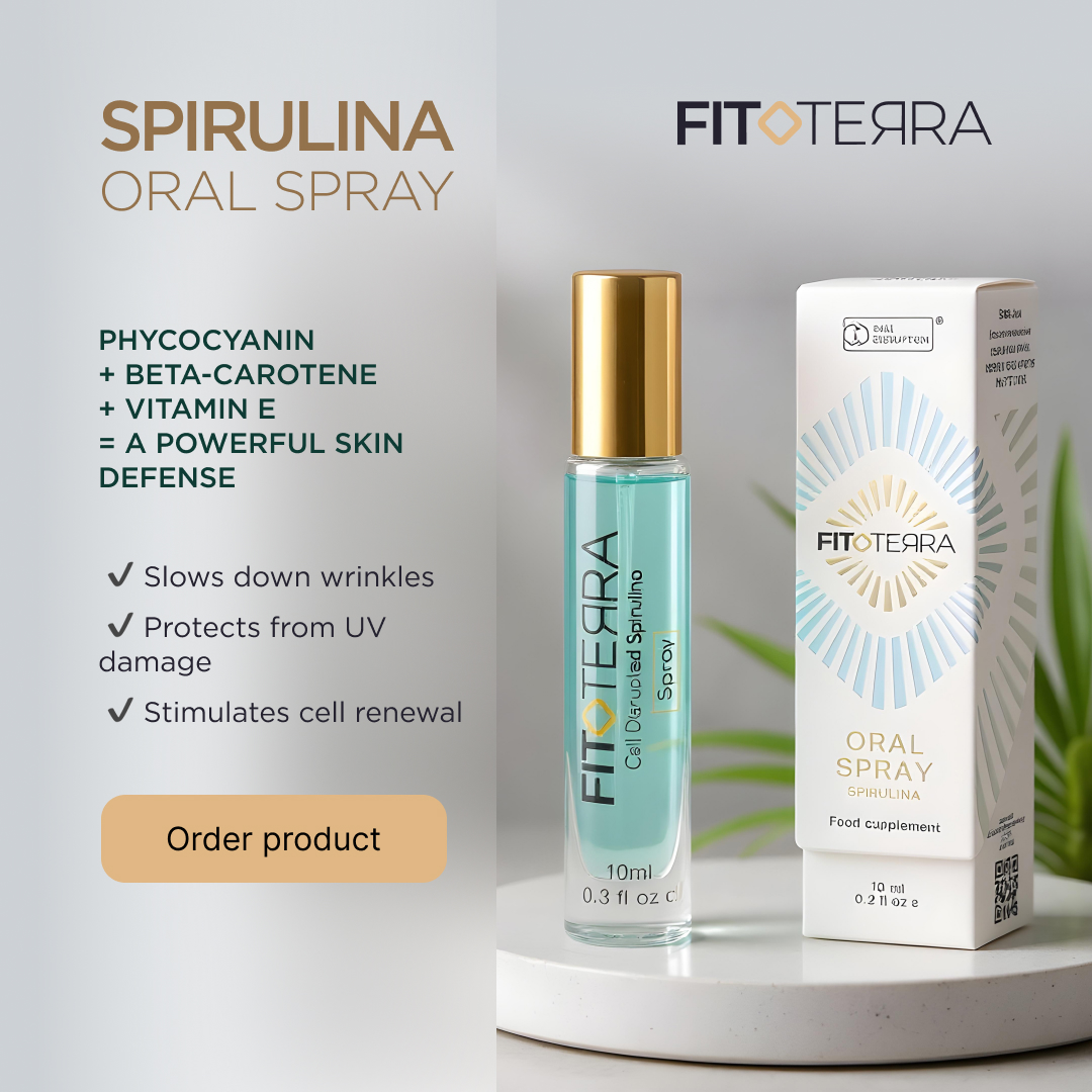 1 Spray (0,1 ml): Spirulina quantity – 0,05 mcg.